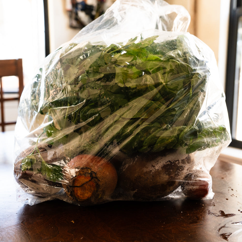 Included in the Harvest Bag is a possible variety of in season produce: mixture of purple and/or orange carrots, red and/or gold beets (w/out tops), kale, swiss chard, collards
